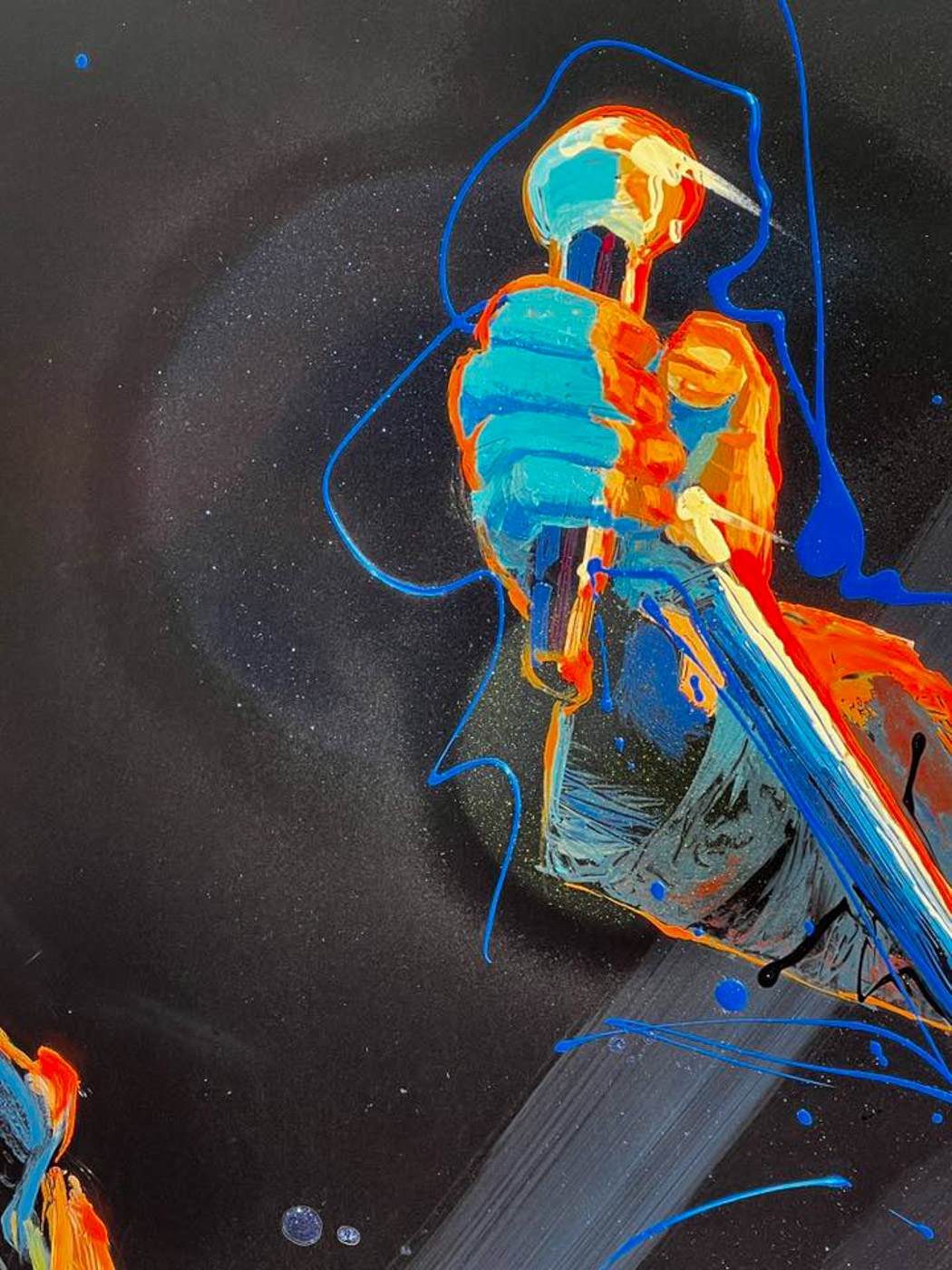 This commission played with the intense use of light,color and loose splashes of enamel paint. I find commissions most rewarding. The back and forth collaboration with the client, and seeing their smiles once they witness the result of our effort come to life. This client also collects signed guitars. I painted their signed guitar into the painting, making it even more personal.