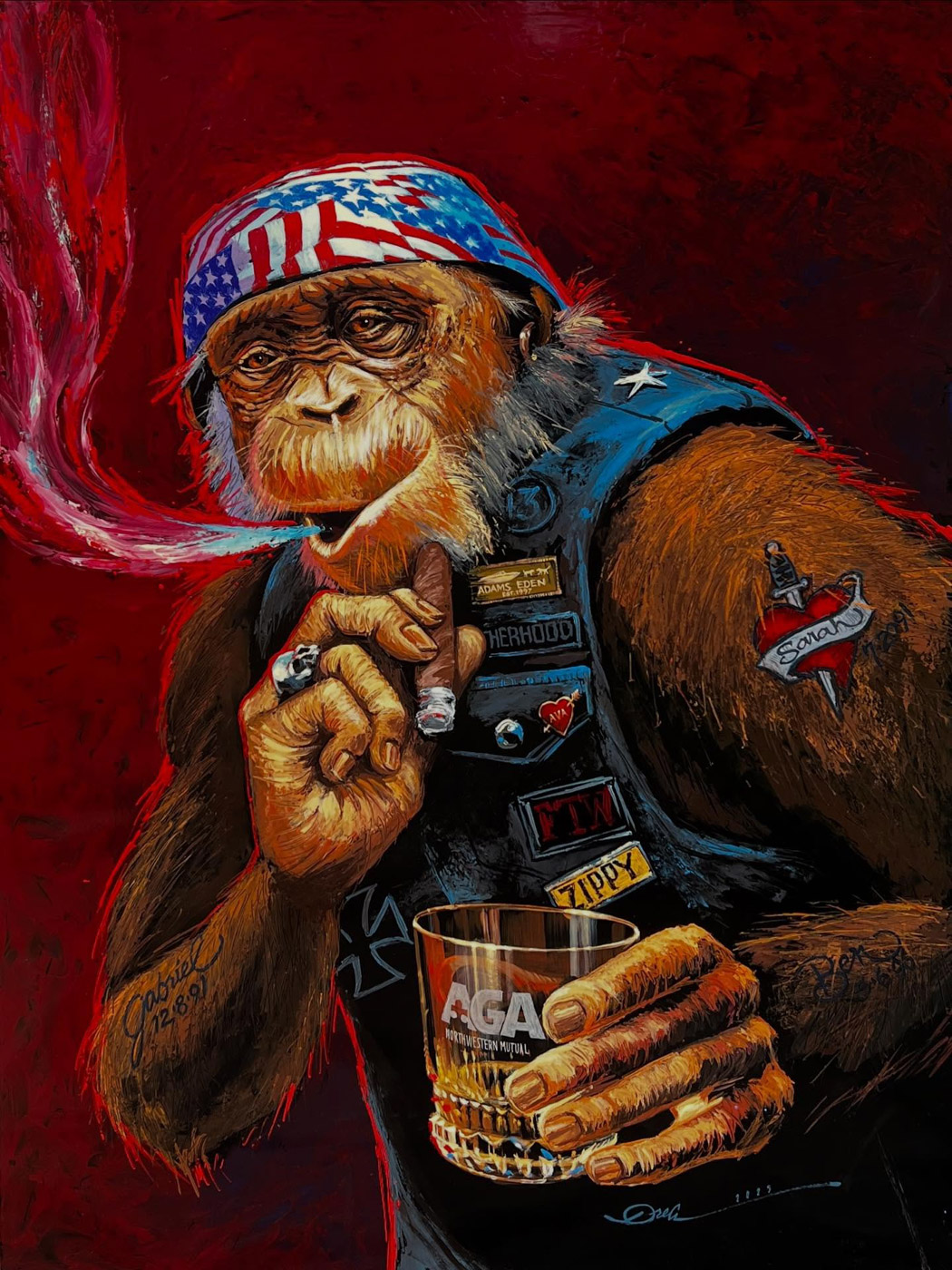 My client liked the chimp paintings I’ve been doing and had an idea to riff on that and a stuffed toy monkey, “Zippy” he had as a wee lad. What would Zippy look like all grow’d up? Incorporating key elements of personal meaning in his life and a biker as the metaphor for deep honor and loyalty, and strength, many can be found as pins and patches on the vest, and tattoos on his arms. With his head wrapped in the American flag, smoking a big cigar and sipping his favorite bourbon in a glass with his company logo etched on it.